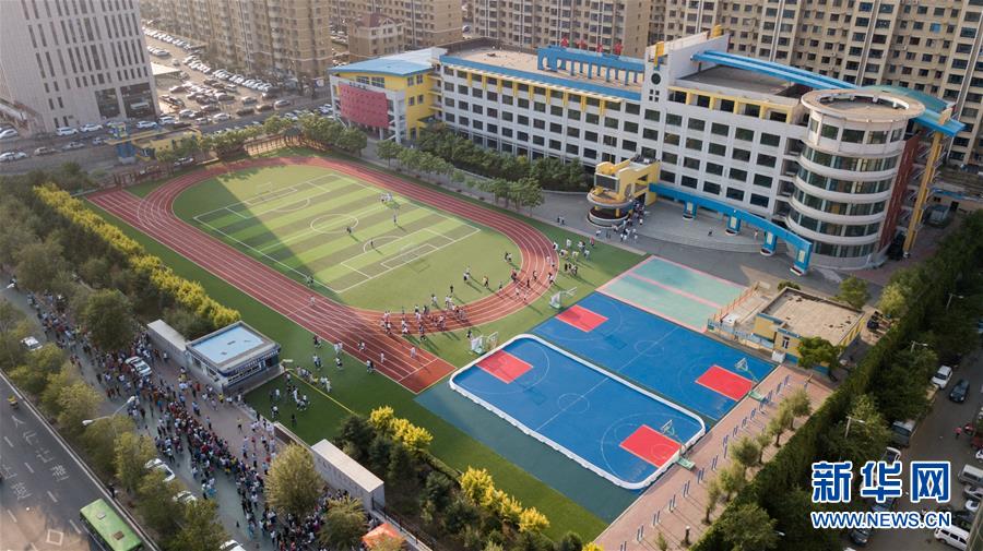 6月8日,在吉林长春市第五十六中学考点,考生们在考试结束后陆续走出考场(无人机拍摄)。当日,全国部分地区2018年高考结束。新华社记者 张楠 摄