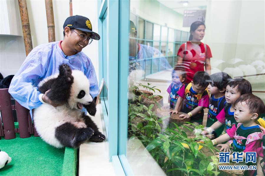 6月7日,在马来西亚吉隆坡附近的马来西亚国家动物园,阿克迈勒给前来参观的儿童展示大熊猫宝宝。“兴兴”和“靓靓”2014年由中国租借给马来西亚,它们的第一只宝宝“暖暖”于2015年8月出生,并在2017年11月返回中国。今年1月14日,这对大熊猫的第二只宝宝在马来西亚出生。旅马大熊猫的“高产”与阿克迈勒团队的悉心照顾密不可分。他们每天分两个班次,每个班次12个小时。日常工作包括准备竹子、做熊猫“月饼”、清理笼子、训练熊猫、维护保育中心等。大熊猫的食物包括五种精选竹子、胡萝卜、苹果以及由鸡蛋、大豆、玉米、大米等原料烤制的熊猫“月饼”。