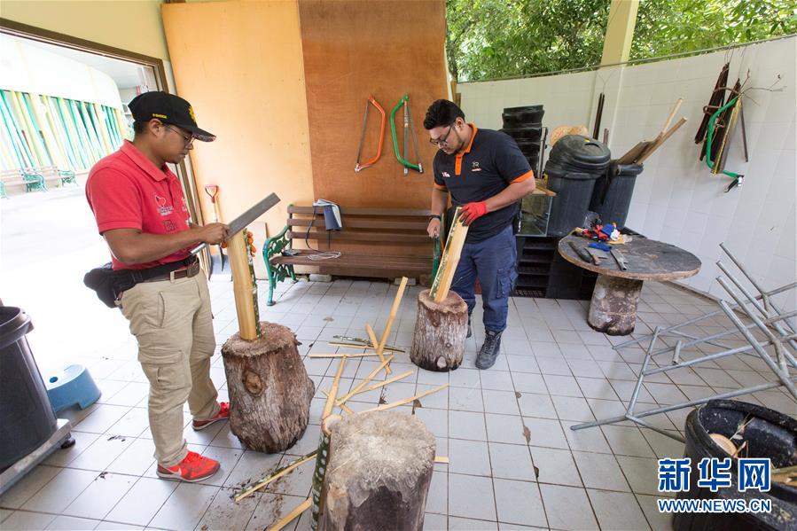 6月7日,在马来西亚吉隆坡附近的马来西亚国家动物园,阿克迈勒(左)与同事为大熊猫准备竹子。新华社记者朱炜摄