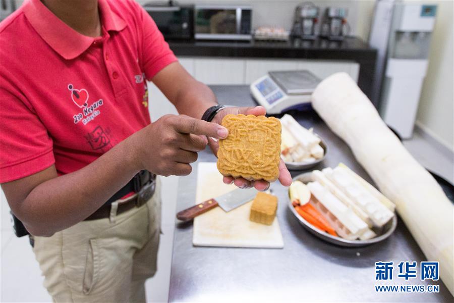 6月7日,在马来西亚吉隆坡附近的马来西亚国家动物园,阿克迈勒展示印有大熊猫名字的特制“月饼”。这对大熊猫来马之前的名字分别叫做“福娃”和“凤仪”,来到马来西亚之后有了新名字“兴兴”和“靓靓”。新华社记者朱炜摄