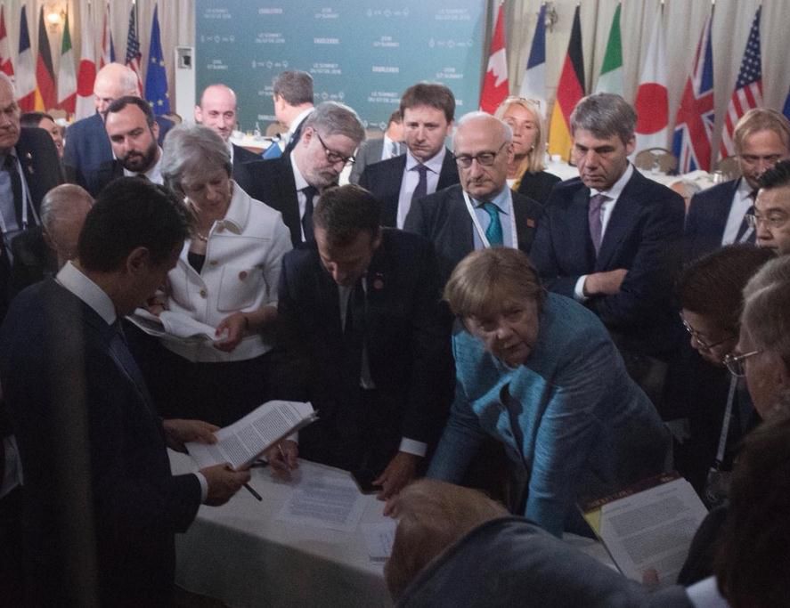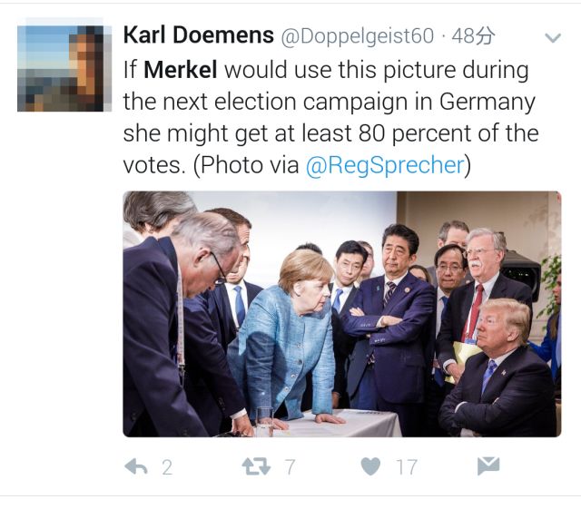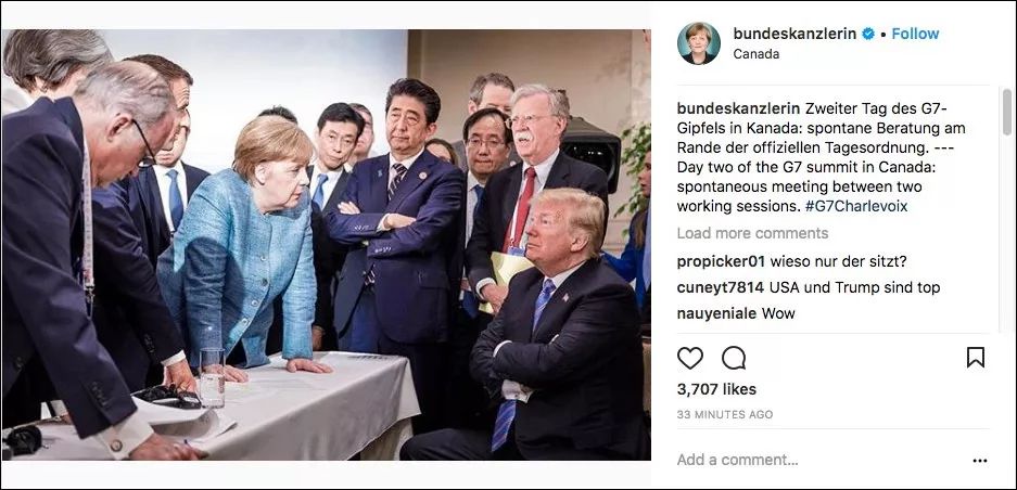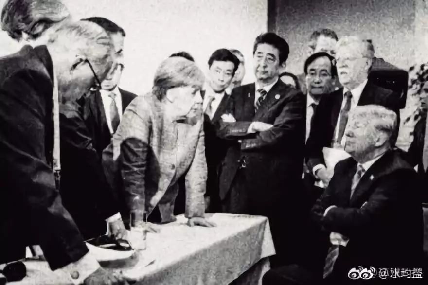 昨晚,德国总理默克尔在网上传了一张今年G7峰会的照片,气氛剑拔弩张。