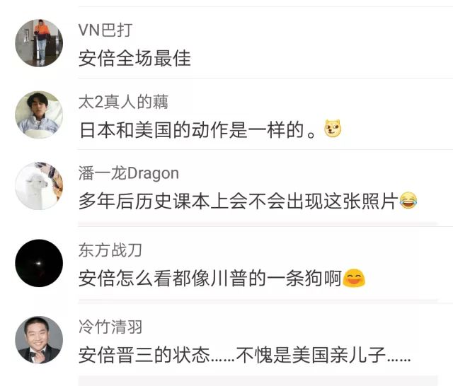 许多喜好“吃瓜”的中国网友也对这张照片表达了自己的看法。但是大家的重点居然都放在做人难,做老好人更难,做特朗普身边的老好人更是难上加难的安倍晋三身上。