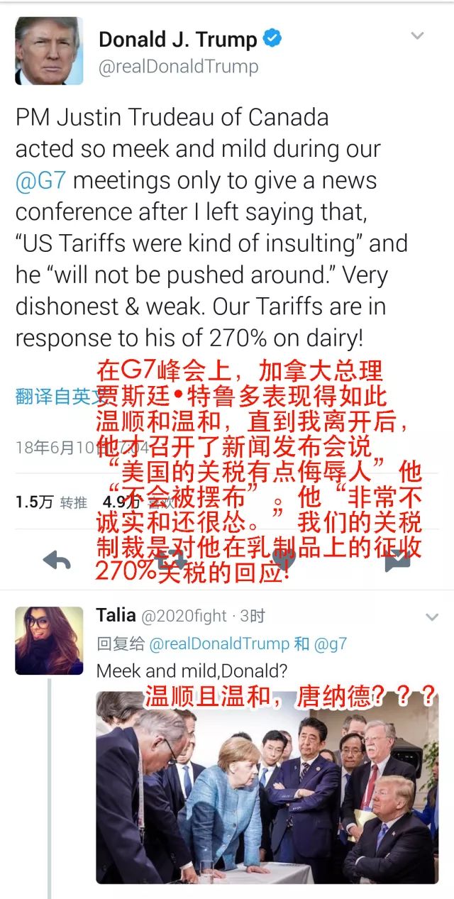 因为本届G7峰会上西方国家吵得不可开交,比如最新的一个“瓜田”就是离开加拿大的特朗普发推称加拿大总理特鲁是个孬种且虚伪。