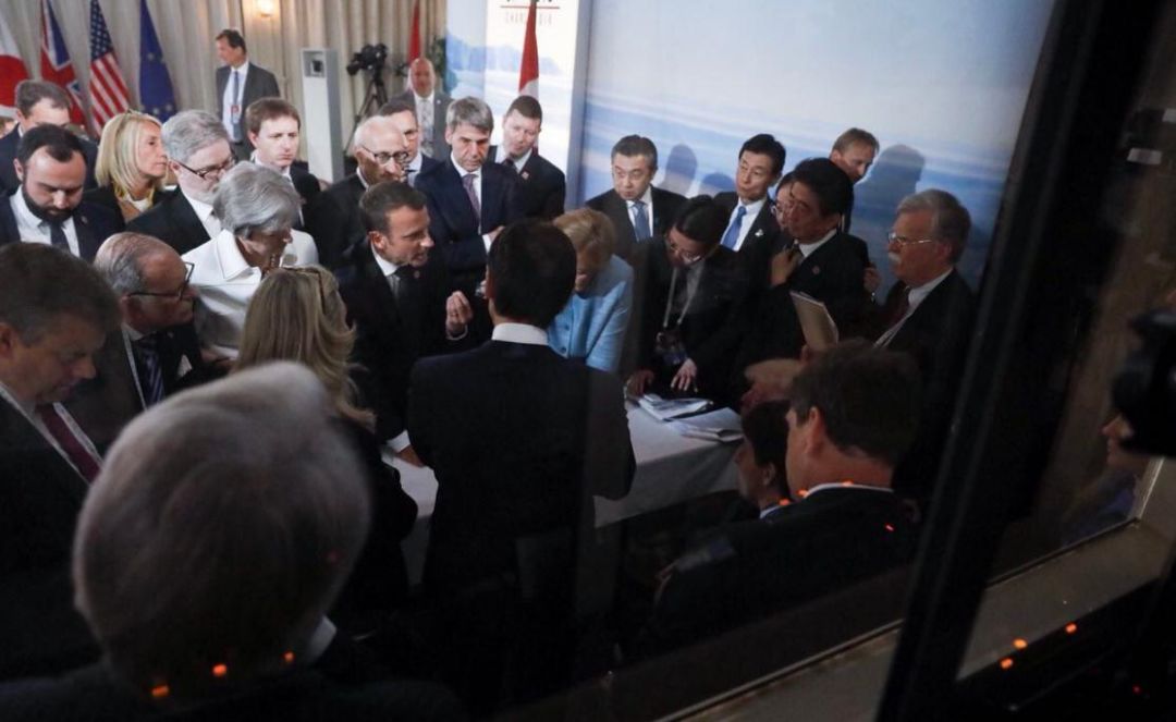 所以在G7国家大分裂的背景之下,这幅照片不排除是快门按得快的西方记者在“搞事情”,用巧妙的构图来表达特定的“主题”。所以随后这场会议的其他照片相继被放到网上后,又提供了更多视角让网友解读,比如说以下这张美国版照片,看起来特朗普是坐在众多西方国家领导人的“簇拥”之中,分明一副“你大爷还是你大爷的样子”嘛。