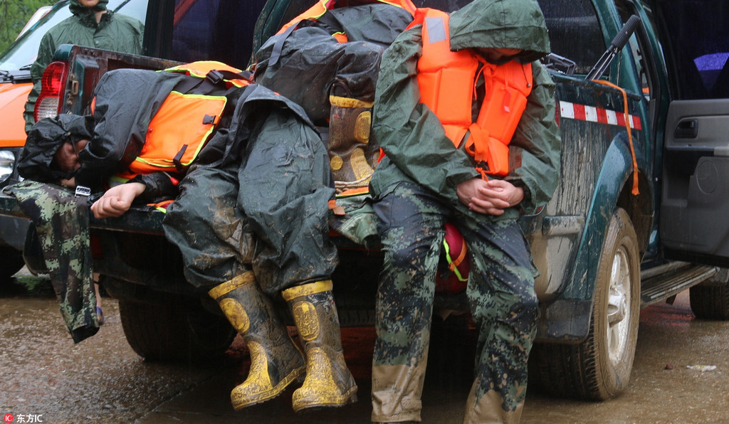 辛苦了!抗洪救灾民兵应急队员靠车上睡着