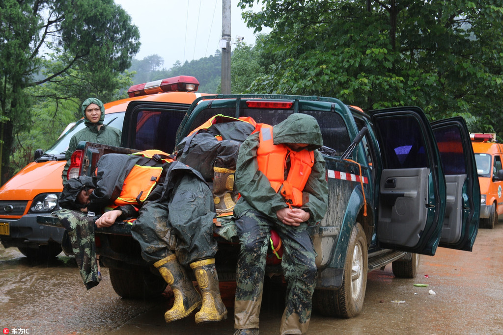 辛苦了!抗洪救灾民兵应急队员靠车上睡着