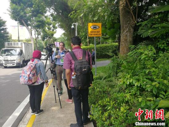 在圣淘沙岛嘉佩乐酒店外,有记者正在做报道。现场工作人员向记者确认,会晤在嘉佩乐酒店举行。 徐方清 摄