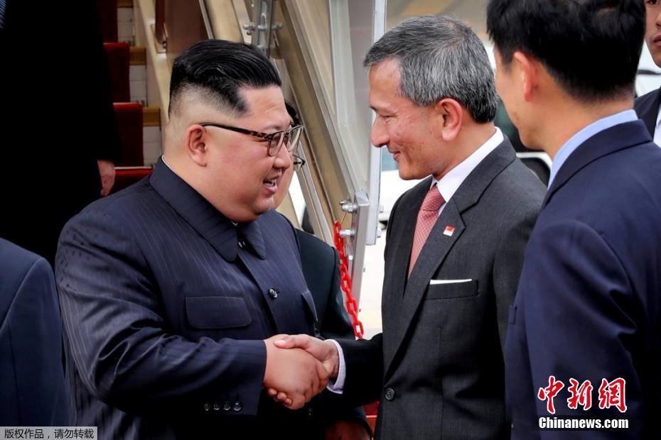 新加坡外长维文(中)在机场欢迎金正恩(左)到来。