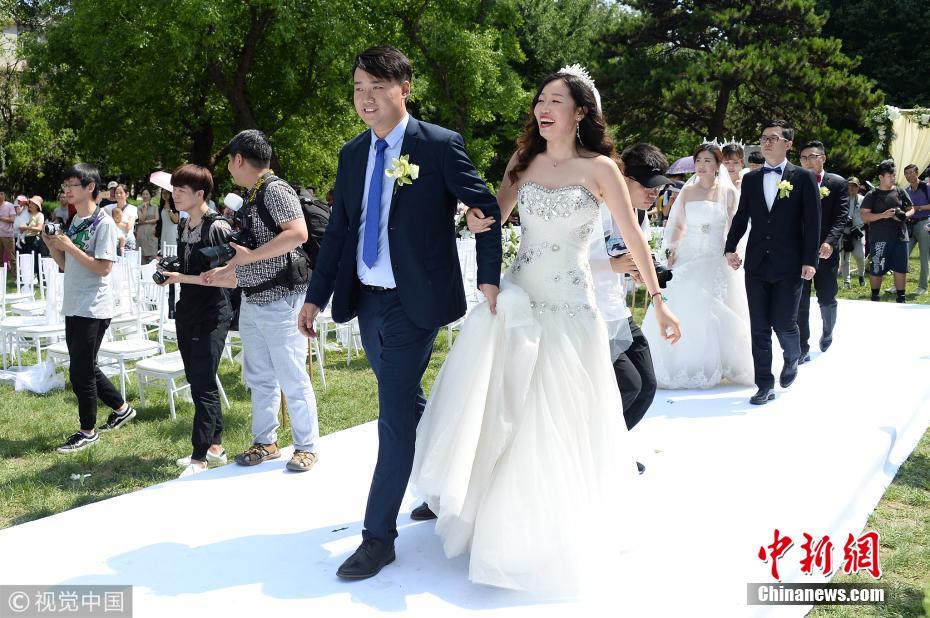 新人们的老师、同学和亲朋好友一起见证了神圣而庄严的校园婚礼。 图片来源:视觉中国