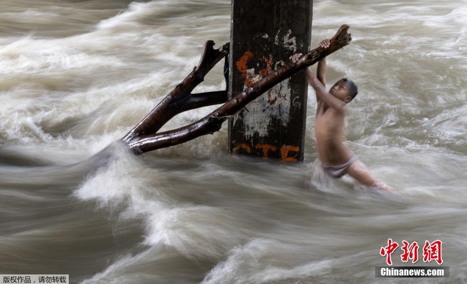 菲律宾暴雨河水暴涨 男孩大玩跳水童趣十足