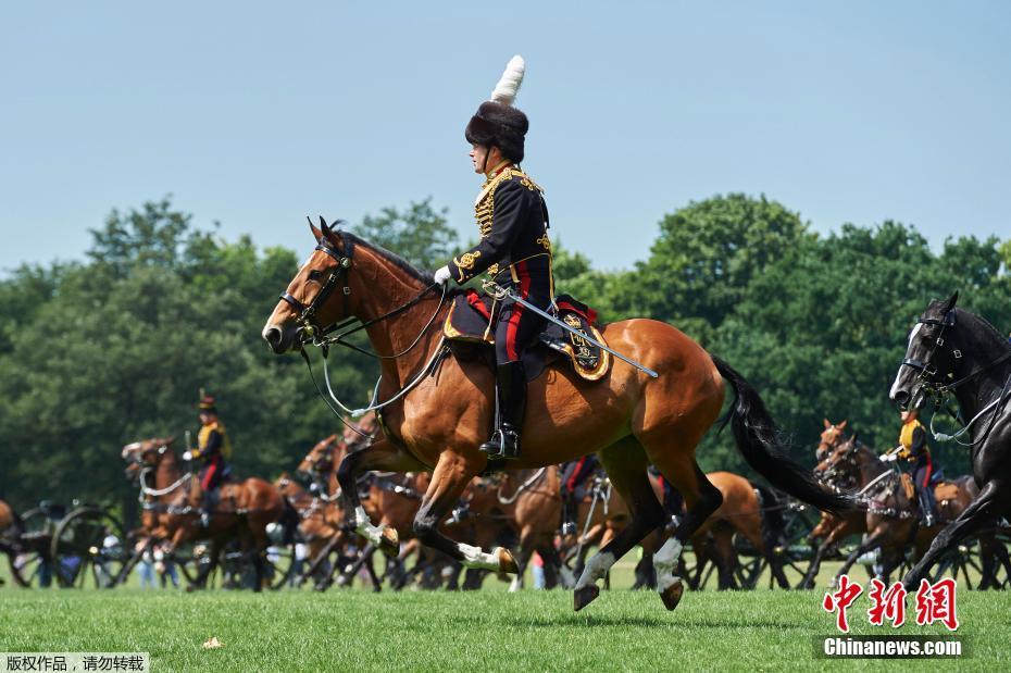 当地时间6月11日,英国伦敦,皇家骑马炮兵团鸣响41响皇家礼炮,庆祝菲利普亲王97岁生日。
