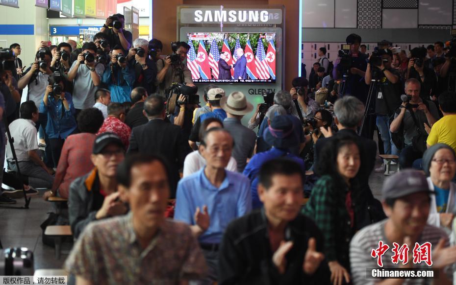 韩国首尔的一个火车站里,人们在观看会晤直播的时候鼓掌。