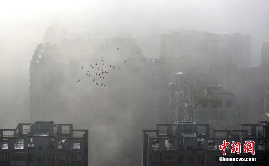 6月12日清晨,成都城区东面出现“平流云”景象,一些楼宇被雾气包围或笼罩,宛如仙境。平流云是当较暖的气团经过一个较冷的下垫面(如冷水湖)时所形成。 刘忠俊 摄