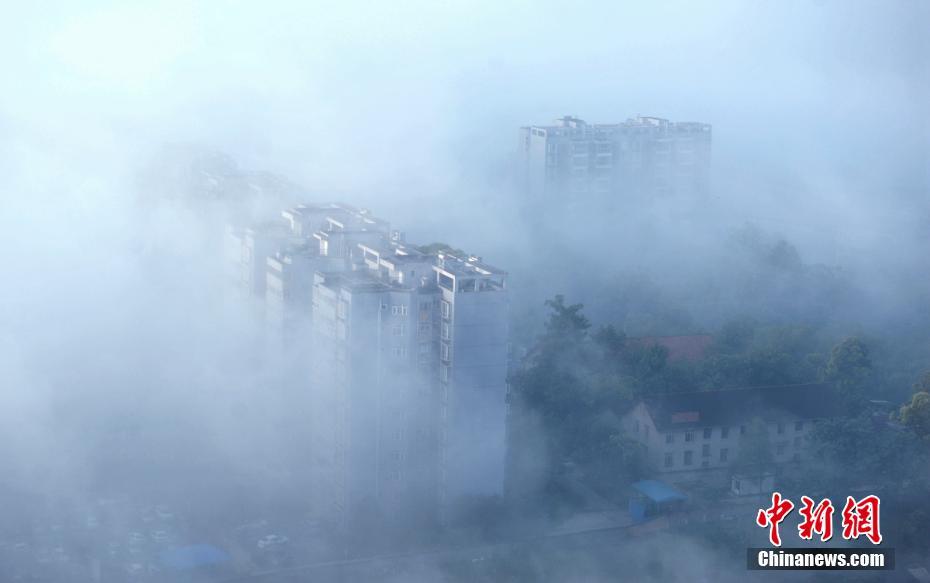 6月12日清晨,成都城区东面出现“平流云”景象,一些楼宇被雾气包围或笼罩,宛如仙境。平流云是当较暖的气团经过一个较冷的下垫面(如冷水湖)时所形成。 刘忠俊 摄