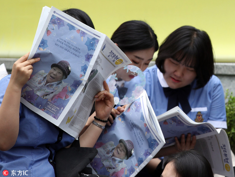 当地时间2018年6月13日,韩国首尔,众多韩国民众在日本驻韩使馆前举行周三例行集会,敦促日本解决慰安妇问题。
