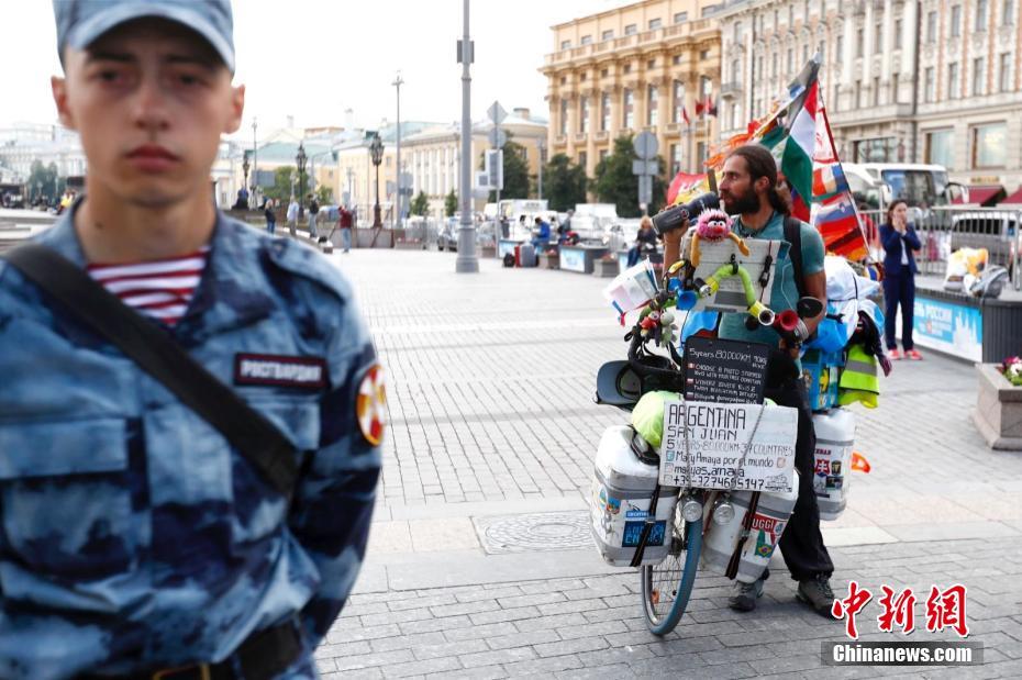 图为一名阿根廷球迷推着挂满装备的自行车。 中新社记者 富田 摄