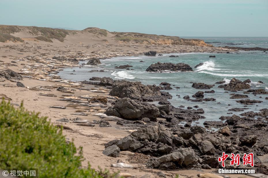 2018年6月13日讯(具体拍摄时间不详),美国加州,阿根廷摄影师Lucio Moujan镜头下的圣西蒙海滩,整个海滩被阳光下午睡的象海豹占领。摄影师说道,“那里大概有数百只象海豹吧,我不知道具体数目,但是那有一大群。不仅仅是那片海滩,他们也躺在岩石顶部或是附近的海滩上。 图片来源:视觉中国