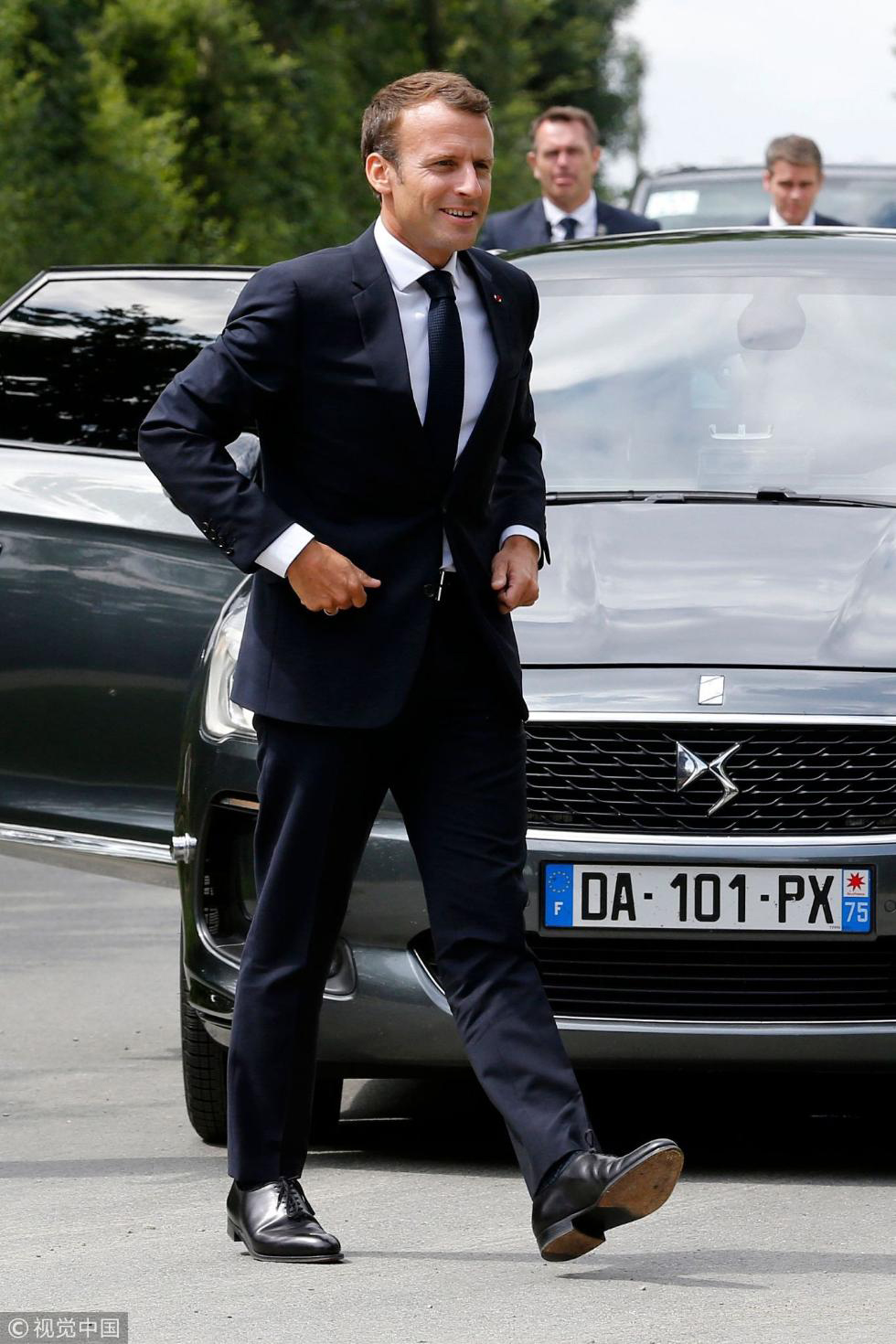 当地时间2018年6月13日,法国旺代省,法国总统马克龙前往一战时期法国政治家乔治⋅克列孟梭墓献花,与民众互动自拍。图/视觉中国