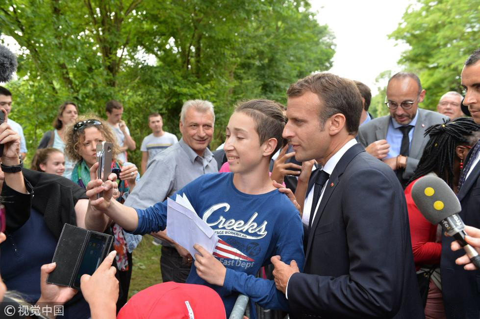 当地时间2018年6月13日,法国旺代省,法国总统马克龙前往一战时期法国政治家乔治⋅克列孟梭墓献花,与民众互动自拍。图/视觉中国