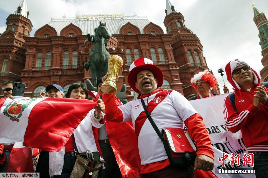 当地时间6月14日,2018俄罗斯世界杯揭幕战即将在莫斯科卢日尼基体育场打响,场外球迷集结造势。