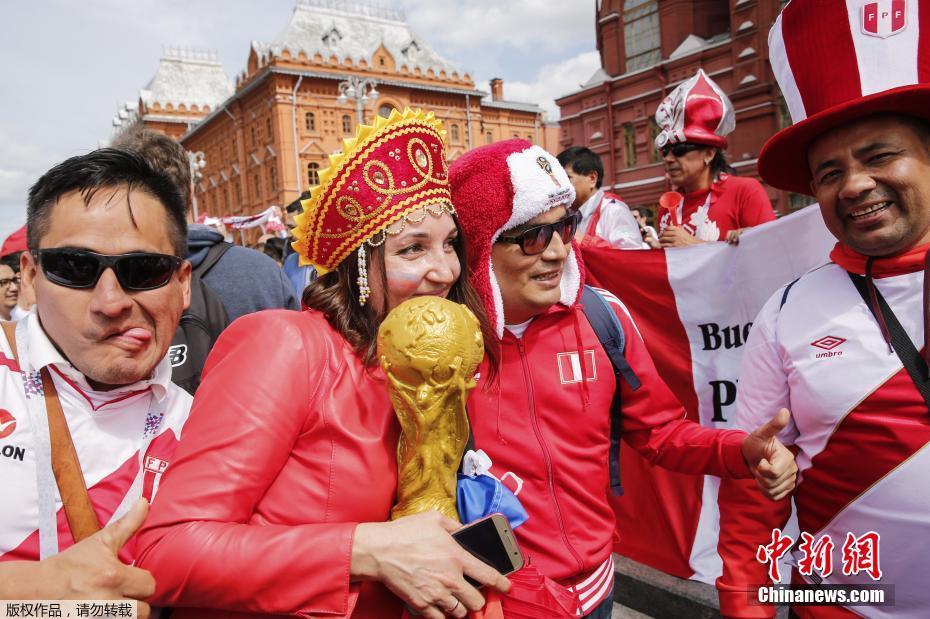 当地时间6月14日,2018俄罗斯世界杯揭幕战即将在莫斯科卢日尼基体育场打响,场外球迷集结造势。