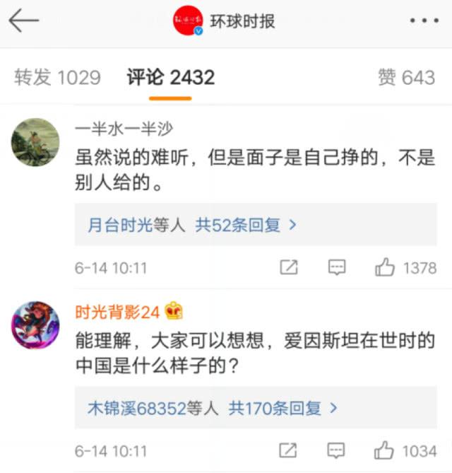 其中,不少中国网民的看法是,当时的中国和中国人恐怕给外国人的印象就是这样的。更何况鲁迅先生在爱因斯坦来到中国4年前(即1918年)发表的《狂人日记》中也深入地讽刺和批判了当时中国社会和中国人令人绝望的精神面貌,并揭示了封建礼教对中国人思想的荼毒。