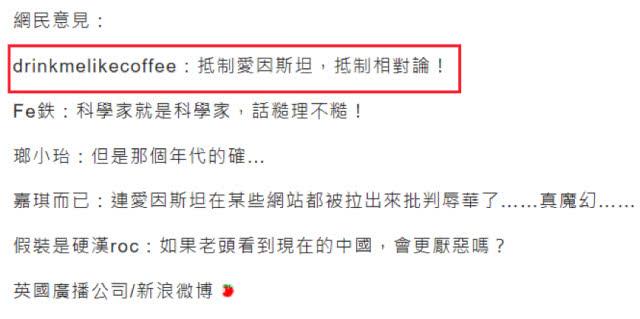 所以,他在评论爱因斯坦这个事时留下那句“抵制爱因斯坦、抵制相对论”的评论,看起来更像是他在“预设靶子”黑“小粉红”。可《苹果日报》却反而把他挑了出来当成了“内地网民”都是“无脑愤青”的典型,这也算十分“魔幻”了。