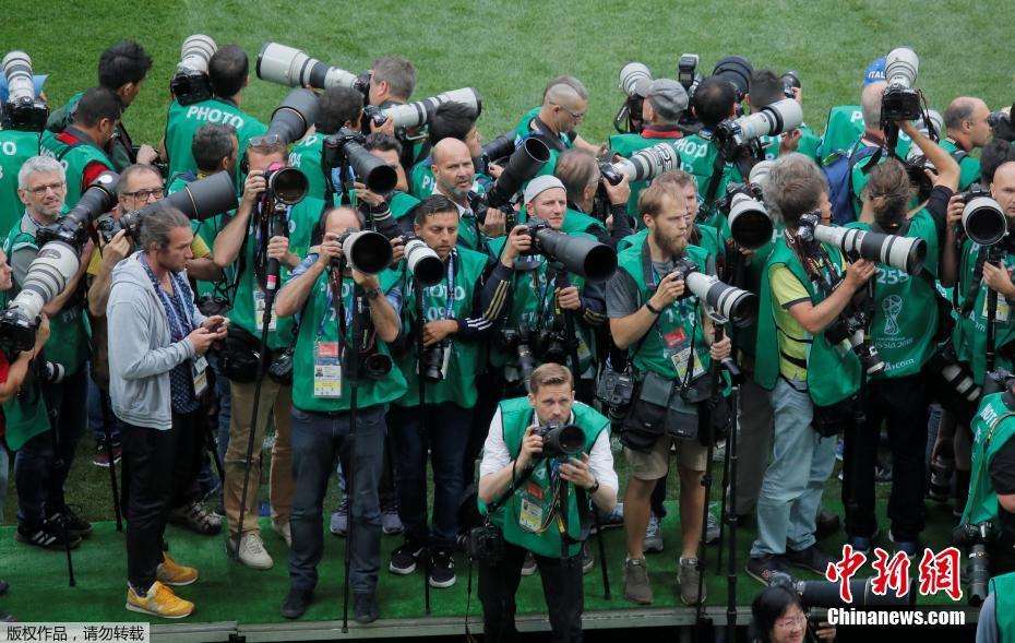 北京时间6月14日23点,俄罗斯世界杯揭幕战在莫斯科卢日尼基体育场打响,东道主俄罗斯对阵沙特阿拉伯。图为大批媒体记者关注赛事。