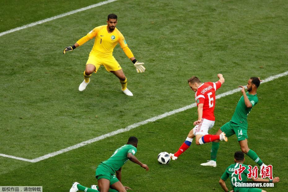 第11分钟,俄罗斯队利用角球机会将球打入禁区,沙特队后点防守漏人,8号加辛斯基头球破门为俄罗斯队首开纪录。这也是本届世界杯的首粒进球。