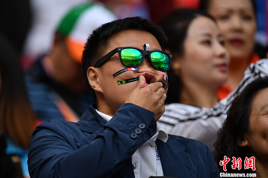 北京时间6月14日23点,俄罗斯世界杯揭幕战在莫斯科卢日尼基体育场打响,东道主俄罗斯对阵沙特阿拉伯。比赛现场,各国球迷俨然成为一道亮丽的风景线。 中新社记者 毛建军 摄