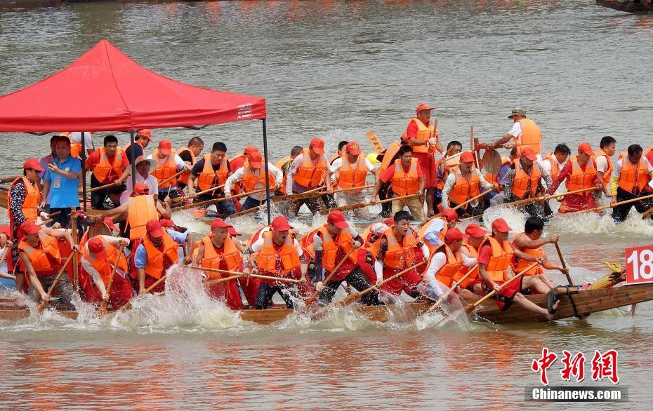 6月14日,龙舟队伍在江西南昌市新建区松湖镇锦江之上竞渡迎端午。当日是农历五月初一,南昌市新建区松湖镇举行划龙舟活动,该镇有农历五月初一至初五划龙舟迎端午的习俗,乡亲们都要通过划龙舟来祈求风调雨顺,国泰民安。陈斌 摄
