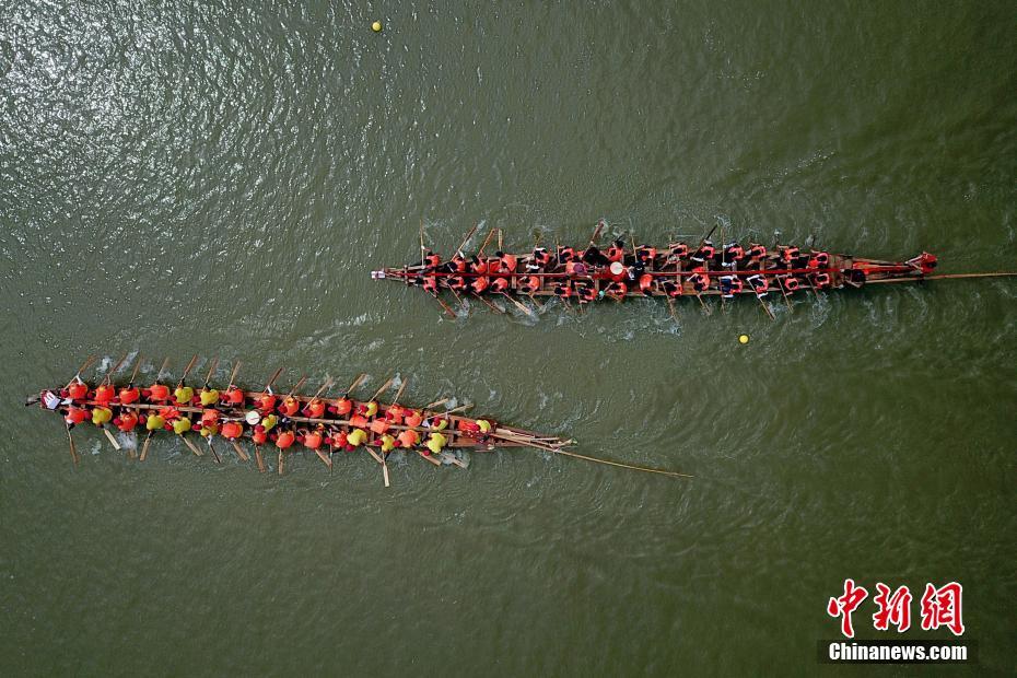 6月14日,龙舟队伍在江西南昌市新建区松湖镇锦江之上竞渡迎端午。当日是农历五月初一,南昌市新建区松湖镇举行划龙舟活动,该镇有农历五月初一至初五划龙舟迎端午的习俗,乡亲们都要通过划龙舟来祈求风调雨顺,国泰民安。陈斌 摄