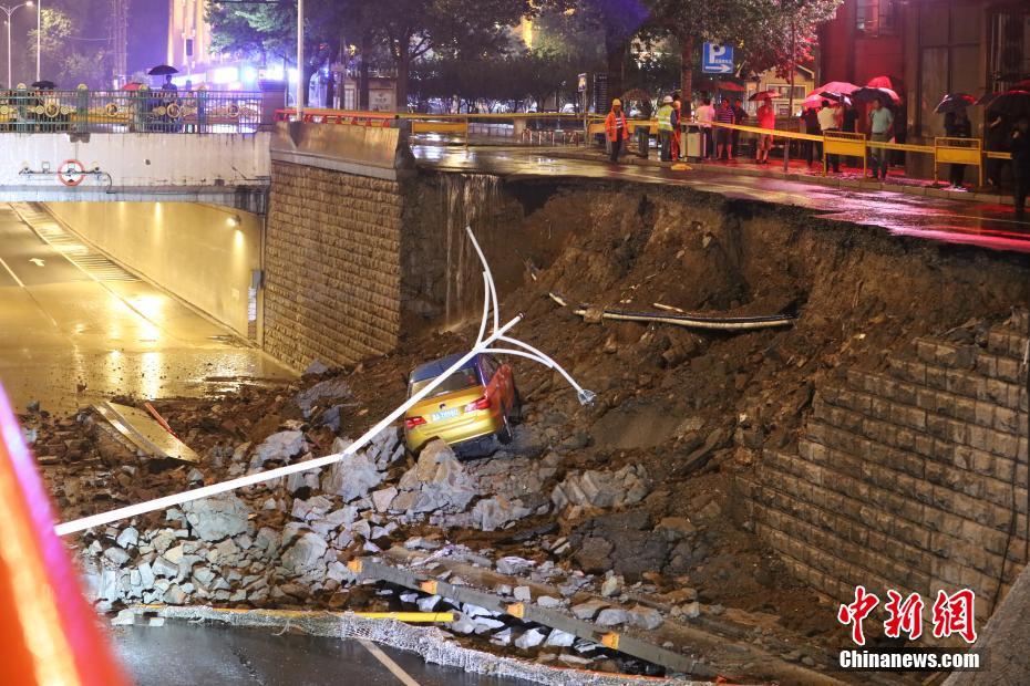 6月14日21时左右,哈尔滨市南岗区北京街(木介街向满洲里街方向)地下桥引桥一侧墙体发生坍塌。记者赶到现场看到,桥体上方一辆出租车也同时掉落到桥下,驾驶员与车内一名乘客轻微擦伤。目前,辖区交警已经在现场进行警戒,相关管护单位陆续赶到现场进行勘察。图为事故现场。 中新社记者 于琨 摄