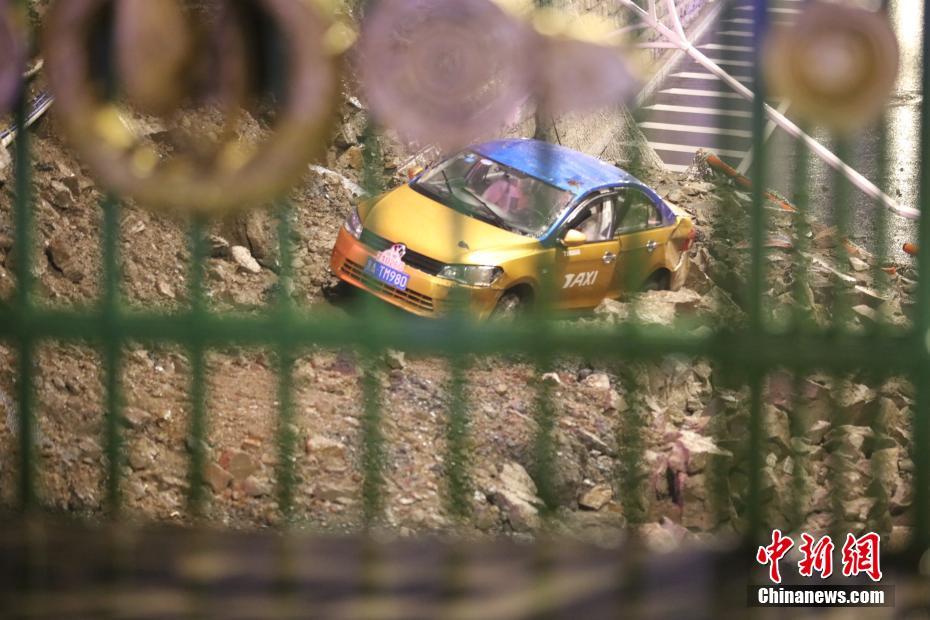 6月14日21时左右,哈尔滨市南岗区北京街(木介街向满洲里街方向)地下桥引桥一侧墙体发生坍塌。记者赶到现场看到,桥体上方一辆出租车也同时掉落到桥下,驾驶员与车内一名乘客轻微擦伤。目前,辖区交警已经在现场进行警戒,相关管护单位陆续赶到现场进行勘察。图为事故现场。 中新社记者 于琨 摄