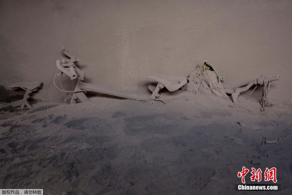 当地时间2018年6月8日-11日,危地马拉圣米格洛斯洛特斯村(San Miguel Los Lotes),曾经有住户的房屋如今被富埃戈火山喷发后的火山灰覆盖,生活戛然而止。火山于6月4日开始喷发,至今已有114人死亡。图为餐厅被富埃戈火山喷发的火山灰覆盖。