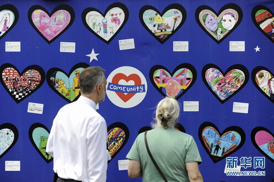 6月14日,在英国伦敦,人们观看一面纪念墙。