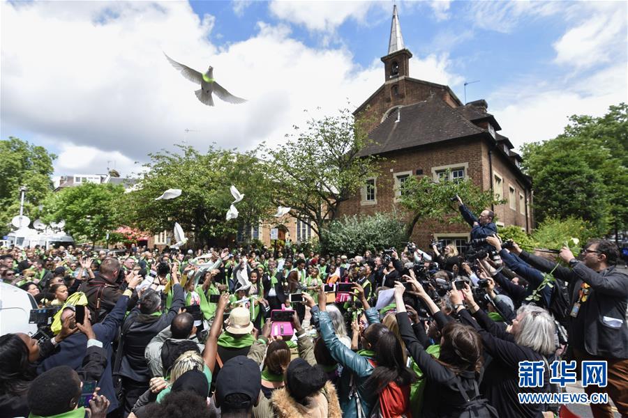 6月14日,在英国伦敦,民众在圣海伦教堂前放飞白鸽悼念遇难者。当天是格伦费尔大火一周年纪念日。2017年6月14日凌晨,位于伦敦肯辛顿区的格伦费尔大楼四层一间公寓厨房的冰箱起火。由于楼外墙面使用了易燃材料,大火迅速蔓延并吞噬这栋24层高的居民楼,酿成英国自第二次世界大战以来最严重的一场火灾——72人丧生,上百户家庭无家可归。新华社发(史蒂芬·程摄)