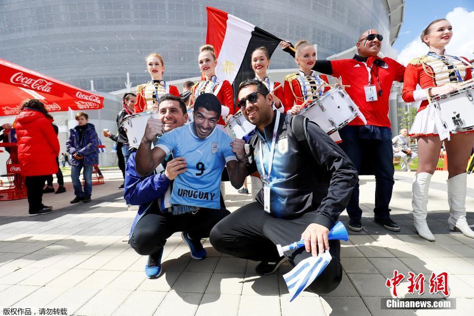 当地时间6月15日,2018俄罗斯世界杯小组赛A组埃及Vs乌拉圭即将在叶卡捷琳堡球场举行,场外两国球迷开始集结。