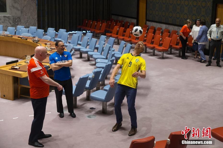瑞典常驻联合国副代表斯科在安理会会议厅颠球。 中新社记者 廖攀 摄