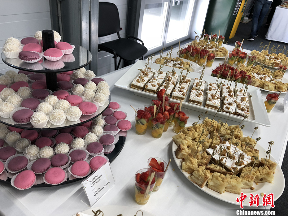 当地时间6月15日,记者探访俄罗斯喀山竞技体育场的媒体中心,特色的俄罗斯甜点吸引众多记者品尝。每到比赛日前,喀山竞技体育场的新闻中心都会提供免费的食物给前来采访俄罗斯世界杯的媒体记者。 中新社记者 田博川 摄