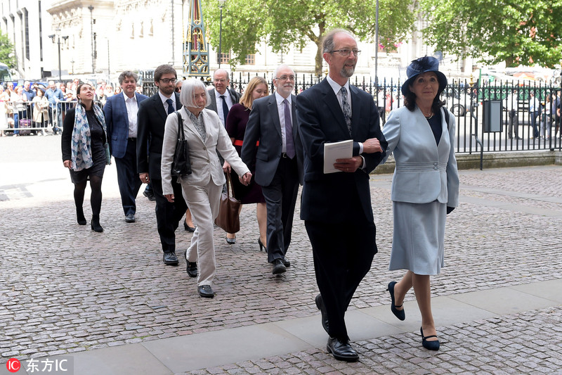 当地时间2018年6月15日,英国伦敦,已故英国科学家霍金的追悼和骨灰安葬仪式在伦敦西敏寺大教堂(威斯敏斯特大教堂)举行,众多政要名流到场出席。英国物理学家霍金今年3月逝世,其葬礼已于3月31日在剑桥大学举行,伦敦西敏寺大教堂15日将举行其骨灰安葬仪式,让他和牛顿、达尔文等伟大科学家为邻。