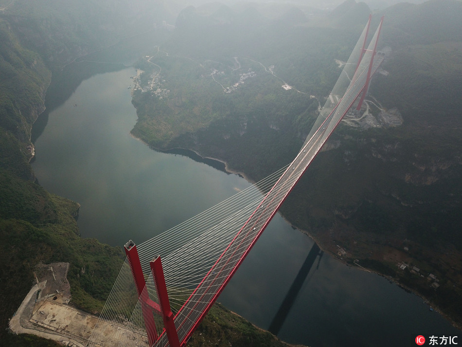 An aerial view of the 1,450-meter-long Yachihe Bridge in Qianxi County in southwest China's Guizhou Province, on Thursday, April 12, 2018. The 800-meter span of the Yachihe Bridge sets a world-record for a steel truss girder cable stayed bridge. [Photo: IC]