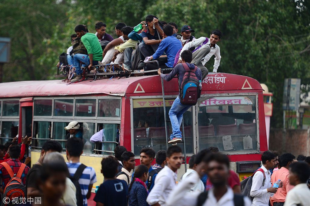 ​当地时间2018年6月18日,印度阿拉哈巴德,报考警校的考生参加笔试后搭乘巴士回家。