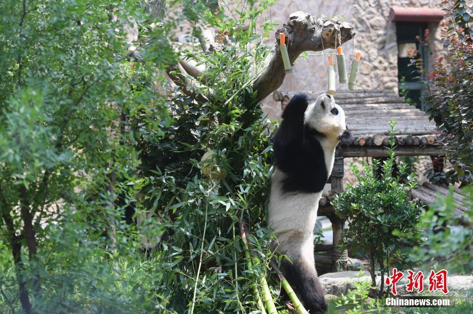 动物园里迎端午 大熊猫爬上爬下吃“粽子”