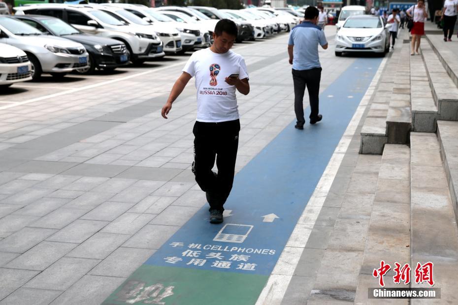 6月19日,民众看着手机步入“专用通道”。近日,西安街头出现一条专为“低头族”设计的通道,宽约一米,并注明“低头族专用通道”字样。中新社记者  张远 摄