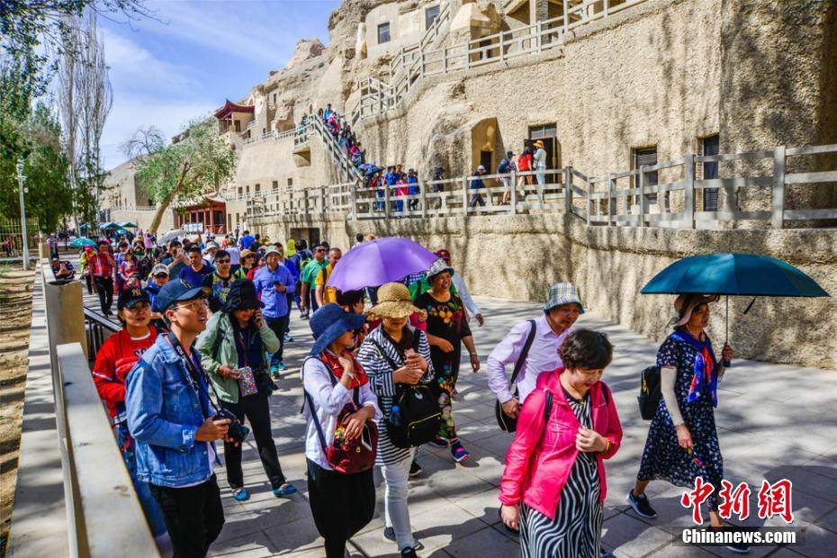 大批游人在莫高窟景区参观游览。王斌银 摄