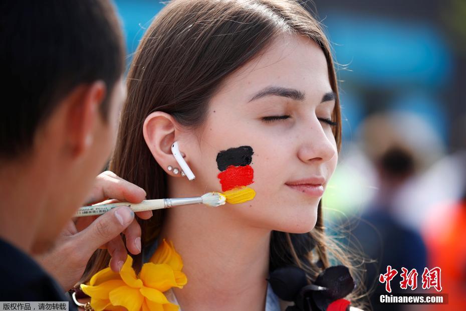 当地时间6月17日,德国队与墨西哥队的比赛在卢日尼基体育场举行,赛前一名德国队女球迷往脸上画国旗油彩,为自己的队伍加油。