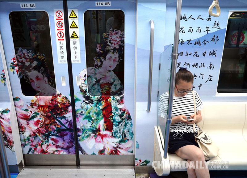 西安地铁推出“唐风诗韵文化专列”,让乘客在唐都长安的风雅诗意中领略现代西安的神韵芳华。(中国日报记者 火炎 摄)