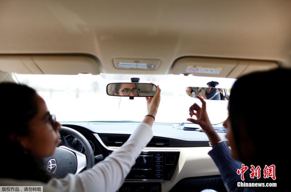 学员玛丽亚·法拉杰(Maria al-Faraj)在调整后视镜。