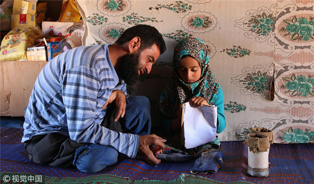 叙利亚难民营现状:残疾女孩用锡罐当双腿